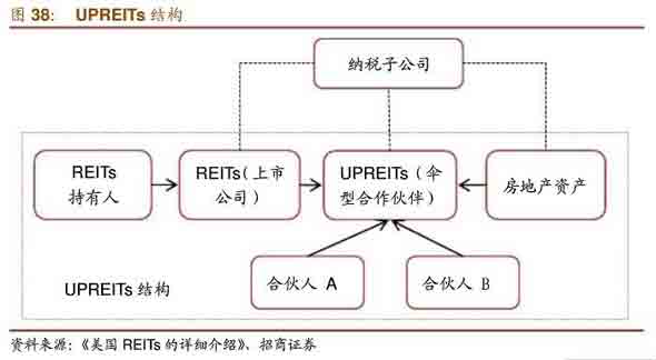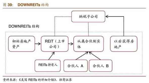 DOWNREITs与 UPRE ITS结构相似,同样是传统RE ITS为了获得税收方面的优惠而演变而来,只是在此结构下,RE ITS直接持有和经营大部分房地产,而新购入或有限责任合伙人出资形成的房地产由下属合伙人实体持有。而RE ITS可以成为多个DOWNREITs合伙企业的普通合伙人。