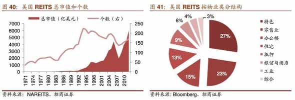 从上市数量来看,REITs在90年代初发展迅速,1 994年到达顶峰,总共226个;.截止至2012年底,美国共有172个REITs总市值超6000亿美元。目前REITs不仅投资住宅,还投资零售,写字楼,工业厂房等,儿乎所有能提供租金回报的物业。在所有上市REITs中,特色REITs(包括仓储设施、高尔夫场等)占比27%、零售物业占比23%、办公楼物业占比15%.,