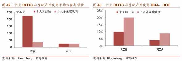截止20 13年9月3日,前十大上市REITs总市值2 241亿美元,总收入250亿美元,前十大房屋建筑商.总市值仅352亿美元,总收入249亿美元。REITs的总收入与房屋建筑商相似,总市值房屋建筑商的6.4倍.,从平均ps来看,前十大REITs是8.83,房屋建筑商为1.13.整体佑值高于开发商,从公司运营层面,前十大REITs平均EPS为2.30,ROE为9.88%,房反建筑商平均Eps 6.54,ROE为20.03%,由于REITs自持