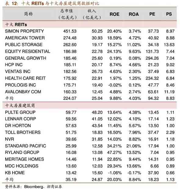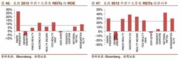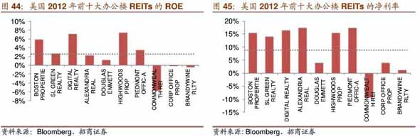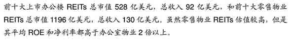 前十大上市办公楼REITs总市值528亿美元,总收入92亿美元,和前十大零售物业REITs总市值1 1 96亿美元,总收入130亿美元,虽然零售物业REITs估值较高,但是其平均ROE和净利率都高于办公室物业2倍以上。