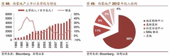西蒙集团(simon Property GroupSPG)是美国最大商业房地产上市公司,其核心业务包括出租、开发及物业管理,业务范围逐步发展至欧洲和亚洲地区。截止至2012底,公司共有317处可供收入物业分布在38个州,其中包括160个购物中心,63奥特莱斯,68个社区中心、13Mills13个其他小型购物店。预计2013年有30个新物业开业运营。近年表,公司在日本拥有8个、韩国2个和马来西亚1个奥特莱斯,国际扩弥泣定度迅猛。自上市以来,公司营业收入年均复合增长率达13%,可租货面积5400万平方英尺扩大到2012年的24300万平方英尺,其中地区性购物中心占比达68%