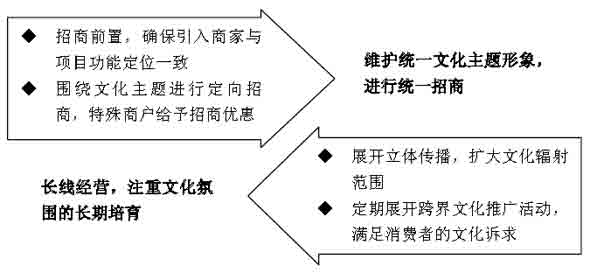 做好招商推广对于商业项目的持续发展只是万里长征走了第一步。注重商业项目的长线经营,奉行养鱼政策,并在此基础上,注重文化氛围的长期培育。(1)紧扣商业主题文化,展开立体传播。提炼商业主题文化精髓或闪光点,并将其融入到包括宣传材料设计、现场推广、回访等营销的每个环节。开展立体传播,包括通过与电视频道、时尚杂志及门户网站等进行合作,开展与具体商业项目文化主题相切合的娱乐节目、电影宣传等系列活动,既可以让商铺投资者及消费者参与互动,又可借助电视、杂志、网络等传播渠道扩大项目的文化辐射范围。(2)定期展开跨界文化推广活动,满足消费者的文化诉求。定期通过与文化界、艺术界、学界、产业界等相关领域的知名企业或知名人物联合,举办与商业文化主题相关的诸如绘画雕刻、影像互动、艺术鉴赏会、派对及音乐会等高品质文化活动,以带给特定消费群体在视觉与听觉上的文化盛宴。