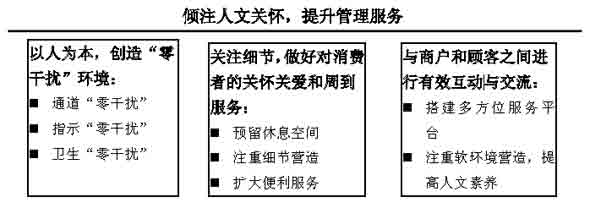 坚信“细节就是品质,坚持就是完美”的理念,通过精细化的服务理念,充分调动、利用一切服务手段,从上班到下班,从台前到幕后,从网上到网下,提供全方位、全天候的周到、便捷服务,以充分体现人性化管理和服务的特性。 坚持细节化管理服务的三个层面:(1)预留休息空间。尊重消费者休憩、停留的需求,如在商场内部,每隔一定空间距离,设计一些人性化的长椅,在中庭处,设立环型的休息椅,满足顾客休息的需求。(2)注重细节营造。如在地下停车场,用不同颜色把不同停车区域区分开来,让停车购物的消费者容易找到停车处;地下停车场进入购物中心的入口装饰暖色调的灯光,给准备购物的消费者一种温馨的感觉。(3)扩大便利服务。如提供自助电脑、商务文印、雨天应急伞、擦皮鞋、洗衣、寄信、寄存物品、小孩托管、宠物托管、上门服务、银联取款机、自动售货机、免费供应饮料等。