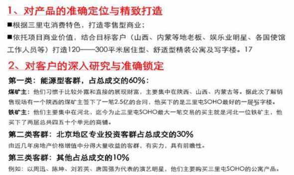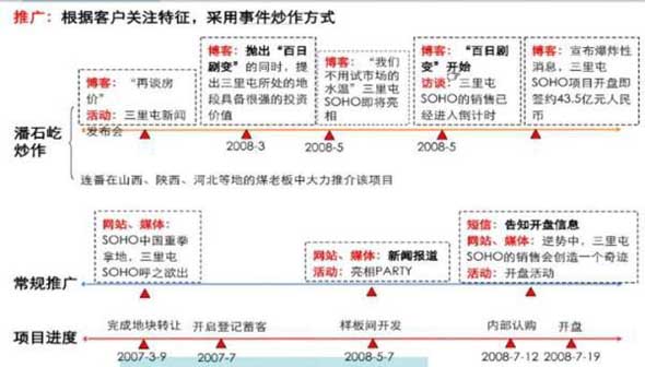 这些成功背后的法宝之一就是SOHO中国拥有的超强销售团队和渠道,稍加研究三里屯SOHO的项目推广和销售过程,我们不得不佩服潘石屹“能把土豆卖成黄金”的销售能力。(如下图)