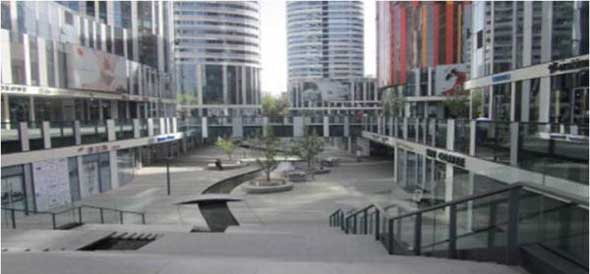 设计的最大亮点就是通过下沉广场等手法,将地下一层打通,形成一个大商业区。下沉式广场的设计使得项目内部的空间变得更为开阔。人们可以直接从项目主干 道的台阶,通往地下一层。隈研吾在还在部分塔楼的2、3层设置了一些室外平台,有多条连廊可供人们直接上至二层,这些设计日后也被包装为“三个一层”的卖 点。这种设计为周边写字楼、公寓的人群提供了一个比较大空间的休憩场所,能让人们在此停留,间接扩大了项目的消费需求。