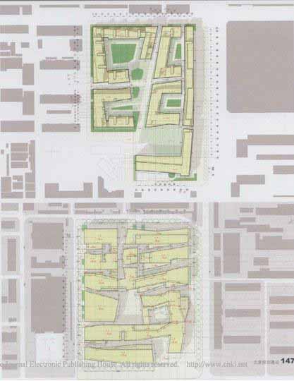 在地块的限高和容积率的控制下,垂直集中式商业布局被否定了,欧华尔决定采用步行商业街区的模式,从2004 年开始,规划设计首先考虑的是城市及地区原本的肌理和历史。将十多栋低层建筑组合起来,建筑的高度和风格各异,因而形成不同的空间和视觉感受,但同时维持 宜人的空间尺度;而许多通道、巷子、小径和庭院,纵横交错环绕于其间,同时形成城市广场。俗话说:“宽街无闹市”。在这种模式下,商铺被安排在相对小的空 间里,不容易留下死角。同时也给人造成人群熙熙攘攘的效果。