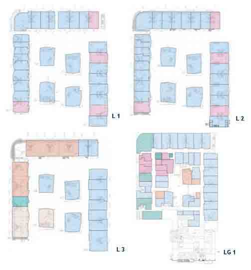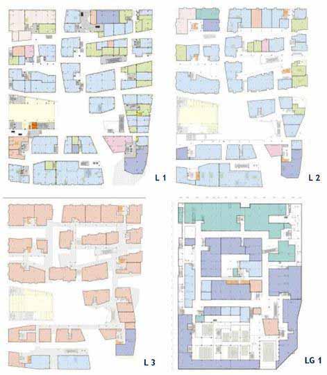三里屯Village各轮总图对比,从上至下为:04年,06年,06年之后北区修改的三轮,最终建成