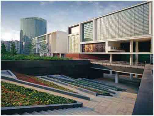 北京金融街购物中心(图2)位于北京市西城区西二环南侧,总用地面积3.3公顷,总建筑面积22万平方米,其中购物中心7.4万平方米、丽嘉酒店4.1万平方米、健身俱乐部0.53万平方米。设计时间为2002年,竣工时间为2007年,属于区域型商业中心。