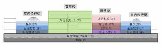 (2)万达广场业态规划原则就是:最核心的主力店处在万达广场“几何中心”,下有超市、电器,上有百货、娱乐楼(含次主力店)共同形成主力店楼。室内步行街是万达广场的灵魂和纽带,把众多的主力店串联起来。