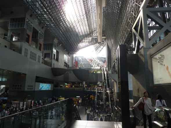 空间设计特色 京都被誉为通向日本历史之门, 因此参加车站大厦设计竟赛的建筑师中安藤、黑川和池原三位日本建筑师都不约而同的引人了“城市之门”的意象. 在建筑体量的处理上采用了门型构图。而原广司则采用了与其他参赛者不同的手法。他认为,在世界的不同地方, 在相同或相似的地理自然条件下有可能产生相似的建筑形式,也即地形对聚落的结构形式起到了决定性的作用。因此, 他非常重视地形在建筑设计中的反映, 他认为, 京都今日仍然清晰的保持着1 20 年前平安京时代的城市形态. 其历史的一个重要内容是城市的地理特征,因此他的方案意图设计成地理上的、作为城市“通向历史之门” 的聚集场所。他采取的方式是利用建筑要素在内部营建了一个仿佛山谷般的巨大空间来象征京都四面环山中间凹陷的地理特征。对这一公共空间形态, 他自己称之为地理学的集合广场”。