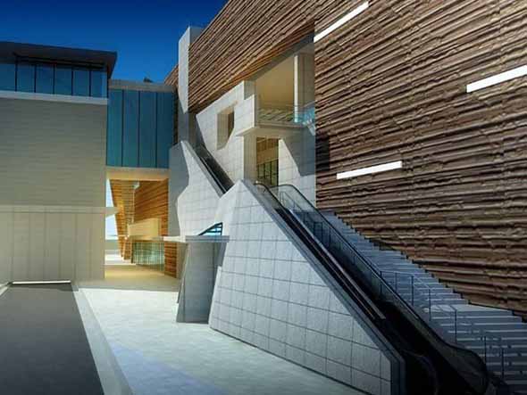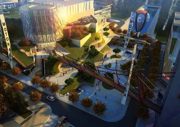 入口处理:在卖场入口树立了一个塔形的标志,指示性的塔标既是指向性的地标又是颇有创意的入口通道。(图2)设计巧妙地运用空中连廊将卖场与购物中心维系成一体。 购物中心部分。外观上创新地使用了“生态屋面”,并辅以立体化的交通手段,以这些新颖的设计吸引人流。这些生态屋面可以被想象成公园内的山坡,消费者可以行走在山坡似的屋面上,体验一把爬山的乐趣。每一层的商业空间都在山坡上有一个开口,便于顾客在“爬山”的过程中随时进入购物中心内部,并且一进去就会发现自己身处商业空间的腹地——购物中心三层和四层这样的核心商业空间内。通过这种入口处理巧妙地提升了内部楼层的商业价值。