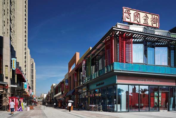 室外步行街采用一店一色的设计原则,简洁大方的设计风格。强调店铺之间的独立感。在颜色上,大胆采用色彩明亮的黄色和红色,形式多样统一。