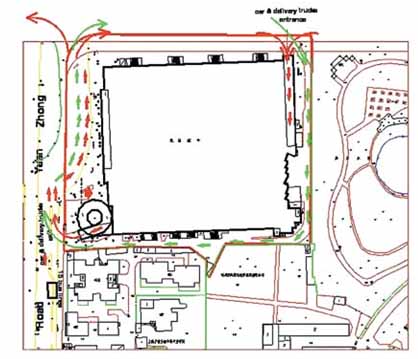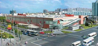 4.4.1.1 大卖场整体设计。店面由上下两层楼组成:即原有一层购物广场、食品大卖公室设在旁边商住房内,便于对卖场实施现场管理。场销售区及扩建后的二楼非食品大卖场销售区,具体规划有:主体大致呈长方形,其正面对中原店,侧面面对嫩江路,正里面的墙体采用高透明的玻璃,这样既能使卖场产生良好的光线效果,同时也能使一楼的shopping mall、促销商品广告尽收外面行人的眼底,引起他们的注意而驻足,进而产生冲动的购买欲望。