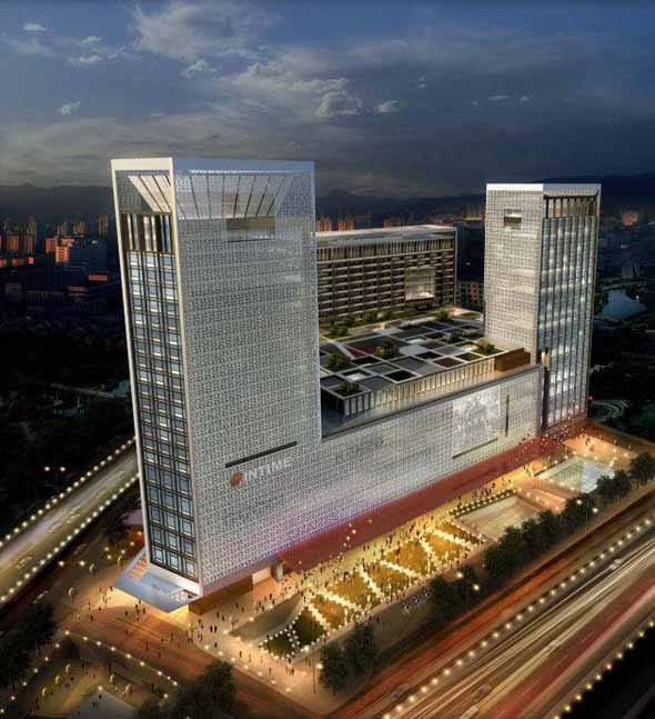 其次,以办公为核心的开发模式是综合体“第二范式”。这一模式与当代中国各大城市的CBD建设紧密结合,规划和建筑形态大多规则有序,而表皮的手法则层出不穷。以新近建成的卓越皇岗世纪中心为例,设计从效率优先的出发点规划布局,总平面采用“井”字型布置四栋塔楼,最高效率的利用了有限的用地,并围合出一个宽阔的矩形广场。在不影响办公平面方正的前提下,建筑表皮利用有规律的对角折面,对塔楼四个角部进行正反两向的斜切,制造近似钻石般富于变化的角部轮廓。【图】设计之中的厦门会展北区综合体亦是如此:建筑平面方正有序,立面呈现节节升高向上收分的渐变节奏,结合了现代元素(带状遮阳片,LED灯带)与传统(塔、灯笼、扇子)传统语汇,演绎出特色的城市新轮廓。【图】