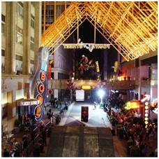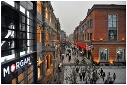 3.2主题娱乐 商业综合体在“主题娱乐”(表1)方面的品质提升,主要通过如下三类方法。一是利用自然地段或历史街区的独特性。例如上海新天地,它巧妙的利用了上海老城区石库门的历史风貌及空间格局,将商业融入其中。并吸引一批名流投资文化娱乐项目,谭咏麟、成龙等百位香港明星开设的“东方魅力餐饮娱乐中心”是明星文化结合餐饮的创意;台湾著名电影演员杨慧珊经营的“琉璃工房”主题餐厅;法国餐厅的巴黎歌舞表演和地下酒窖餐室;日本音乐餐厅也别具一致……这些文化活动的引导,不但提升了商业价值,还使它成为了一张城市的名片。二是将活动与商业空间整合在一起。商业的活动组织,人文氛围对于顾客情绪的调动尤为重要,有的是将演出活动与商业空间加以整合,在美国的The Four Street(图13),本身是位于大型商业综合体内部的一条传统通道,为了提升整体的娱乐氛围,商家将活动的元素融入到商业中,制定了各种演出策略,创造了各类演出场地,为人们创造了一种热力四射的消费环境。再如南京的水游城,将水与表演空间作为商业主题。三是将主题包装引入传统商业街区。武汉万达的中央文化区的汉街(图14)就是这样的例子,在一个现代街区内通过合理的空间尺度,采用武汉近代建筑风格,创造了一个极具特色的主题文化步行街。