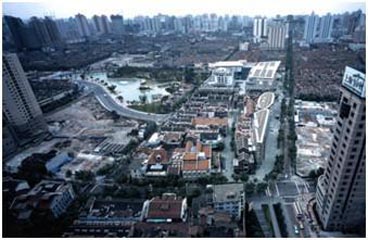 由于社会目的、需求功能发生变化而被淘汰的建筑物可以通过修复、更新,将它们作为新的建筑重新投入使用。将现存的建筑物通过再利用变成商业设施,主要是要赋予商业空间一种历史的厚重感。城市和人一样,也有记忆,因为它有完整的生命历史。以上海新天地为例,地段改造采用了“存表去里”的方式,即对保留建筑进行必要的维护、修缮,保留建筑外观和外部环境,对内部进行全面更新,以适应新的使用功能。把原来的居住功能改造成为具有国际水准的商业、餐饮、娱乐、文化等多功能休闲步行街。拆除一部分老房子,开辟绿地和水塘,美化环境。参见图8,图9。