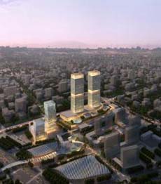 这类商业综合体是由不同大小、数量和形状的体量所构成的较为复杂的建筑群组。如何处理好这些不同体量之间的关系,使之有机自然组合成一体,成为这类商业综合体造型设计的关键。