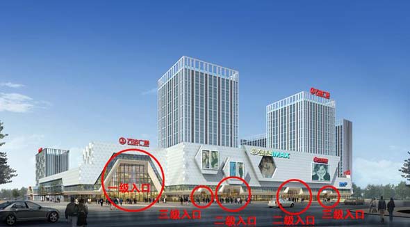 (3)购物中心各主要入口应从立面处理上分出级别,一般来说室内步行街为一级,其它商业业态入口为二级,写字楼、公寓等入口为三级。立面效果上一级入口需最突出,给人较大视觉冲击,二级次之,三级最弱(如图七)。