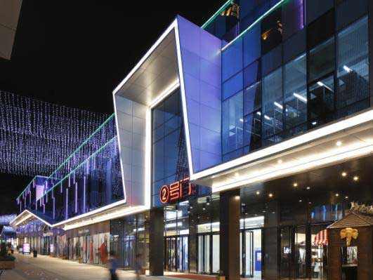 次要颜色可根据商业建筑本身位置及功能的需要,适当采用明度较低,彩度较高的颜色。比如局部门头可采用彩度较高的颜色,活跃商业气氛,突出商业建筑特色。奢侈品店可采用黑色花岗岩或大理石作为墙面材料,辅以金色金属线条以获得华丽,高贵的立面效果。