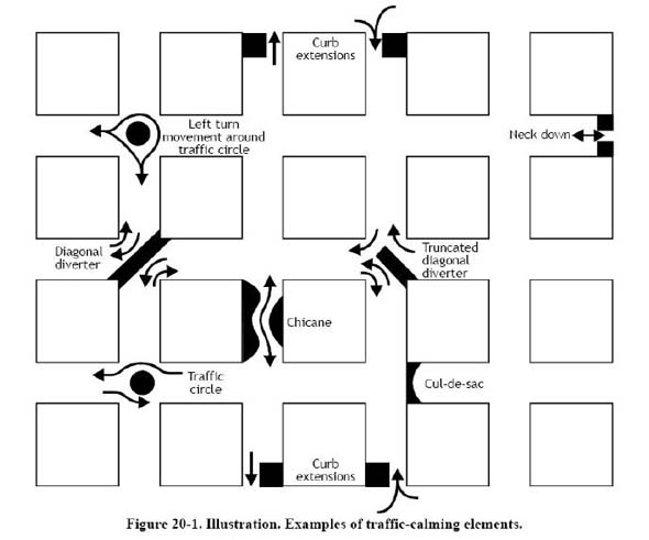 ③ 通过在交叉口设置斜路障、路端上设置通行路来限制车辆的转弯与前行。