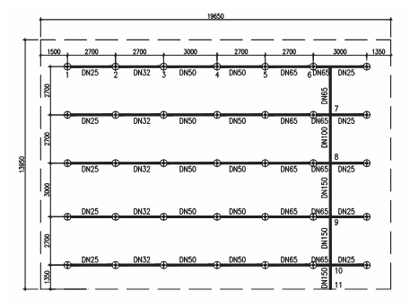 如喷淋管道贴梁底布置,直立型上喷头距板顶距离根据规范要求不应超过0.15m,本设计控制为0.10m,而主梁梁高0.80m,可知喷淋竖向立管长度为0.75m左右,局部可达1.00m,且该段管道管径仅为DN25,根据以往工程实践经验,当空间较大时该段支管稳定性较差,影响喷头的喷水效果,很多此类工程均在该段支管上增加不锈钢拉杆,本工程面积较大,喷头较多,势必会造成消防管网土建投资成本的增加,另外本建筑空调通风及排烟管道较大,而大型商场对层高要求又比较高,因此,需要对喷淋管网的布置进行优化。基于上述原因,经与结构专业协商,从施工难度方面考虑,本设计采用喷淋主管贴主梁底且平行于空调主风管布置(注:空调管道贴梁底),支管贴次梁底,穿主梁,单侧支管连接喷头不超过四个,管径小于等于DN40,结构专业在主梁上预留65mm洞,洞口中心标高为:主梁底向上200mm,由此,竖向支管长度缩短为0.55m,不必采用不锈钢拉杆,管道穿梁处也可作为一个吊架考虑,节省了大量横向支管的吊架,通过对喷淋管网的以上优化,本设计既节省了土建投资,又提高了商场的净空,达到了设计要求。