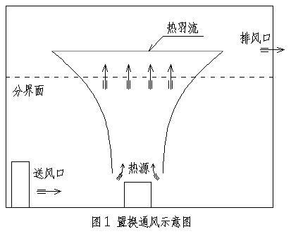 置换通风是将稍低于室温的新鲜空气经送风装置以低速直接送入工作区,送风速度一般为0.25m/s 左右,送风温度通常低于工作区温度2~4℃,以较凉的新鲜空气扩散到整个室内地面。室内的热源(人员及设备)产生向上的对流气流,如图1所示。新鲜空气随对流气流向室内上部流动形成热羽流。整个流场分为两个区域:上区空气污浊,温度高;下区空气清新,温度低。它是以空气的密度差和小量的机械力为动力。