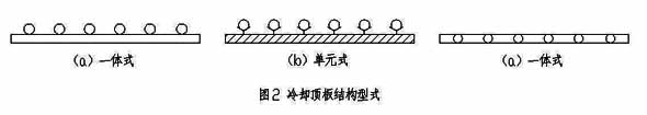 冷却顶板空调系统主要靠冷辐射面提供冷量。冷却顶板水管与金属顶板可以制作成一体,直接形成一顶板单元(见图2a),或者通过传热片把水管和金属顶板联结起来,形成一吊顶单元(见图2b),另外水管也可以以毛细管的形式镶嵌在顶板内,组装成一安装单元(见图2c)。
