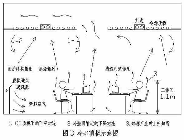 3) 置换通风(简称DV)与冷却顶板(简称CC)相结合系统(Displacement Ventilation Combined with Chilled Ceiling)