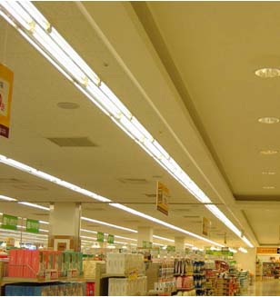 大型超市中照明灯具的种类非常繁多,各家的情况均不相同,少的有二十来种,多的要达到七八十种。这里将超市分为两大区域来讨论,一部分为商品区,另一部分为招商区。目前来说超市内商品区域主要还是采用荧光灯带,照度一般控制在800Lux左右,较高的照度要求主要是为了保证在几千乃至上万平方米的营业空间内光线明亮通透,营造教好的购物环境。如图二所示