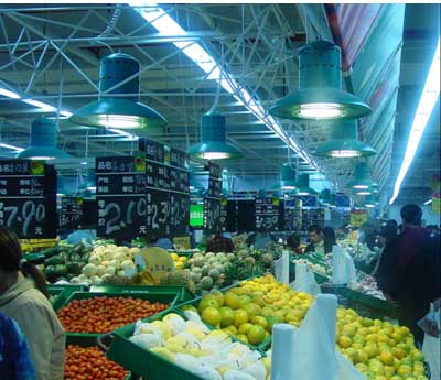 在果蔬区和生鲜区会增设局部照明灯具,灯具主要采用70W或150W的金卤灯,用支架将灯具悬吊在商品上方,一般用灯具所配的灯罩上用颜色对该部分商品区域进行区分,总的来说果蔬区多采用绿色;面点区多为黄色,肉类区多为红色,而水产区则多为蓝色。果蔬区和生鲜区是一个大型超市的重点销售区域,因此在这些区域内会设有较多的广告牌和展示牌,这时会在这部分增设70W的射灯来增加效果。如图三所示
