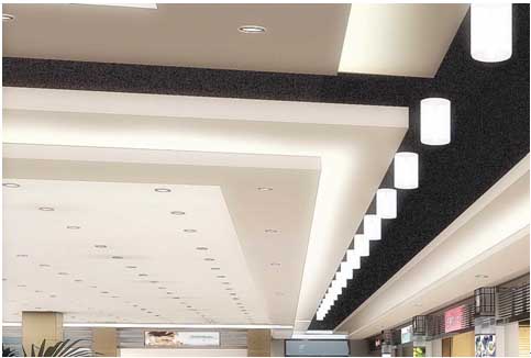 相对于商品区域内的灯具设置,招商区域内的灯具设置的变化就比较多了。相对简单的就是在招商区域内的公共区域和出租岛屿区均布400W的金卤灯,留出四周厅房由租户根据自身特点自行设计;另一种就是根据招商区域的平面布置设计吊顶,出租岛屿区和公共走道对应着不同式样的吊顶,在这种情况下灯具的种类就比较多了,会采用吊灯、射灯、筒灯、灯槽、发光天棚等多种形式,这时灯具的选用就要配合建筑对吊顶造型的要求,如图五所示