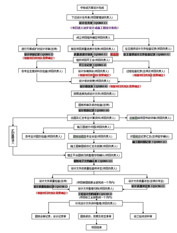 施工图设计管理包含多维度的信息流通,如开发商与设计院、设计院与工程管理技术部、设计院与审图部门、设计院与质量监督部门、施工单位以及施工监理之间的沟通等,这当中存在着许多不确定因素。管理只有将信息从发源端的业主技术部门准确反映在施工图纸上,并传递到末端的施工单位,才能保证最终结果的精确性。许多设计与施工上的失误,近一半是由于信息流通不畅引起的。因此,需要制定合理有效的工作流程(参见图1:项目设计流程图),将图纸设计信息在各参与项目人员之间顺利高效的流转。