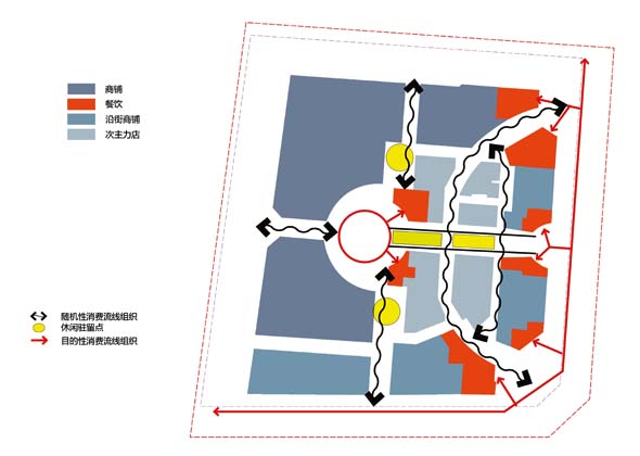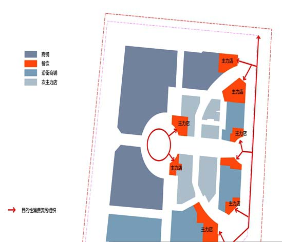 ①商业的目的性消费模式主要指在购买前消费者心中已有了明确的选择,嘉善世茂广场的目的性消费模式是以主力店及餐饮的模式出现。该区的交通步行流线要求有简短直接的提示,不迂回(见下图)。因此在设计上提出流线的通达性要求。