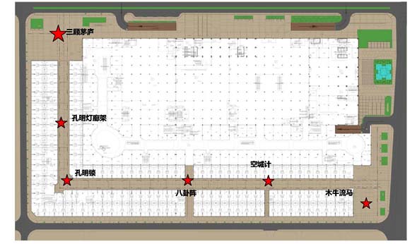根据景观总体功能布局及万达金街的尺度分析,考虑在南北两个外广场设置展示性雕塑木牛流马及三顾茅庐,在总长度达390多米的万达金街设置孔明灯廊架、借东风雕塑、草船借箭花艺、空城计小品等美陈设施,各美陈设施之间间距在70-120米不等,该距离较为符合消费步行长度和消费心理的需求。
