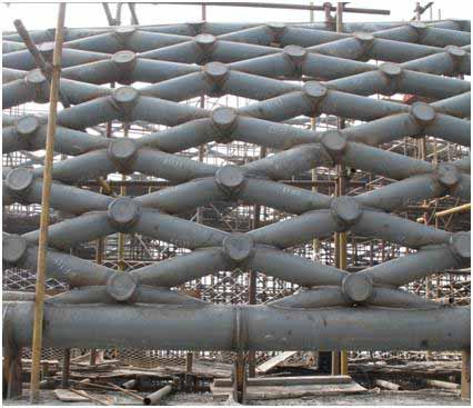 施工方在深化设计并进行样板段制作时发现穹顶部位的钢结构节点施工难度很大且不易实现。专项小组针对此问题立刻组织外方设计师UN、施工图设计咨询方奥雅纳以及施工图设计单位与施工方一起进行综合研究外观、技术及施工便捷,并与项目公司成本部沟通保证其成本是否在目标范围内。经各方研究及充分论证后,建议穹顶部位采用新的“鼓状”节点方式。此节点施工工艺成熟,成本可控,且在中庭下部由于透过彩釉玻璃不易察觉在一定程度上把对效果的不利影响降到了最低。新的“鼓状”节点模式如下: