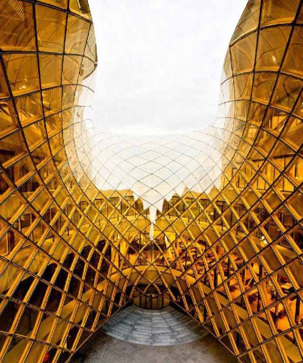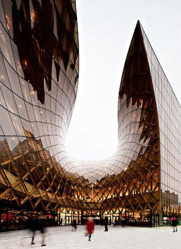 恩波利亚购物中心设计邀请了瑞典国际最知名建筑师格特·温高(Gert Wingårdh)Wingårdh设计的一个特点是“用给人惊喜的建筑入口空间来提升进入主空间的戏剧感”,他擅长复杂的建筑结构,因此入口的琥珀色动感玻璃幕大厅成为该建筑标志:代表了开放性和好奇心,形成了像泡泡一样令人兴奋的世界,又如同一个大大的拥抱,散发出柔软和温暖的气息。
