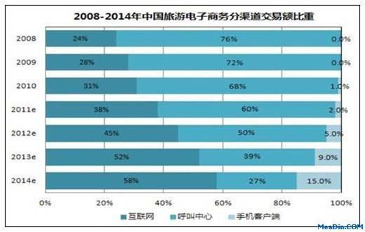 全球在线旅游市场已经非常成熟,据统计有超过50%的旅游预订是通过网络进行,而中国由于起步较晚,在线旅游市场的份额相对还不是较高,但是已经迎来了高速发展的时机,尤其是近几年随着平板电脑、智能手机的普及,移动渠道预订作为一种新型的预订方式受到越来越多的人亲睐。据ForresterResearch统计移动渠道的预订在2008年和2010年期间增长了四倍。目前OTA诸如携程、e龙等、酒店集团诸如开元等都针对iOS系统和Android系统开发了酒店预订的移动终端应用软件,方便宾客可以随时随地进行酒店的预订。随着移动终端支付平台的建设更加完善,移动渠道预订这种新的预订方式势必会被越来越多的人所采用,就如下图中国旅游研究院所预测。