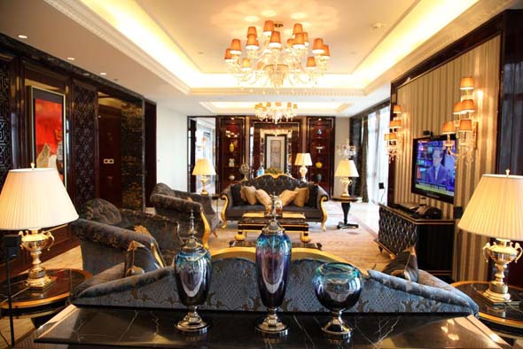 总统套房由若干个房间组成,可分为两部分:一部分是总统及家人使用的房间,包括总统卧室、夫人卧室、办公室(书房)、会客室、会议室、餐厅、备餐间、小型厨房、康乐室、健身室等;另一部分是工作人员使用的房间,包括随从房,秘书房、警卫房等。两部分的房间既需要相互独立,又要求能保持密切的联系。工作人员用房的位置可以与总统套房在同一楼层。其酒店装修设计一定要非常的豪华。