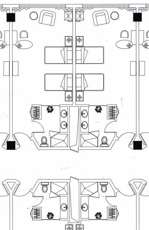 (2)改变客房门对门的尴尬。一是对新建酒店可以从根本上解决,也是最简单的方法,即功能布局图上可以完全错开。二是对土建施工已完成,但还没有进行装潢施工前,可以在装潢功能布局图上将南北客房门错开,从技术层面来说实施起来可行。三是已建成开业运行的酒店改造成时可以采用改变客房门对门有效做法(“歪门斜道”做法)来改变门对门现状,现图二所示为宝应皇冠大酒店实施的案例,开业后效果很好。