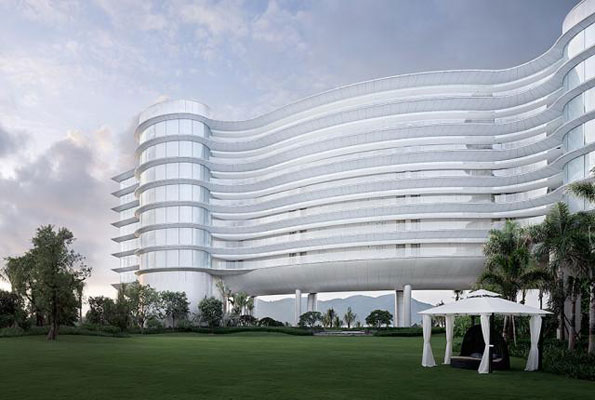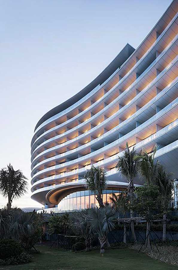 相对于在热带地区建造东南亚建筑风格酒店的传统手段,设计师另辟蹊径,将酒店定位为现代、舒朗而又有滨海度假氛围的独特风格。在设计过程中,抛弃大多数度假酒店惯用的将建筑面向海面围合出花园的方式,独具匠心地单用一条简单曲线,使得酒店几乎所有客房均直面大海。对此,酒店管理公司赞赏有加,并称其为最好的利用海南海景的五星级酒店。在此基础上,结合海南当地气象环境——海风,设计师又把这条曲线抬离地面8米,形成令海风穿行其间的通道,创造出各种功能区域的同时,也为其提供了良好的自然气候。