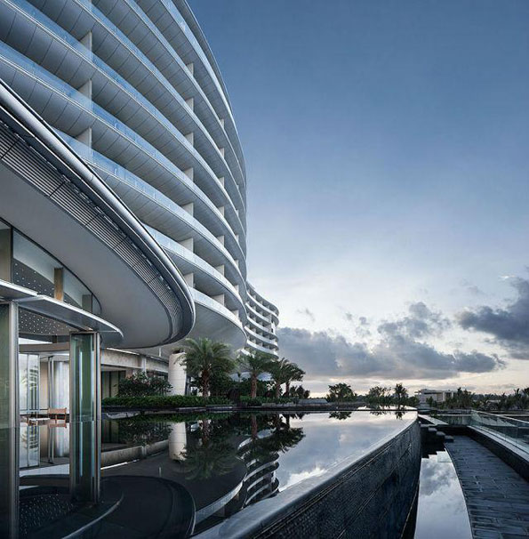 海南强烈的阳光带来了明亮的天空与白色的沙滩。建筑本身的色彩设计与这亮色相呼应。外墙铝板中的珍珠光泽在不同时段的阳光下显现出不同的光泽。加上建筑飘逸的水平线条与通透的淡色玻璃,站在远处遥望,恍惚间仿佛真的看到如此体量的建筑流动荡漾起来。或许只有设计师知道,在这样的观感下其实是扎实稳健的纯钢结构骨骼。