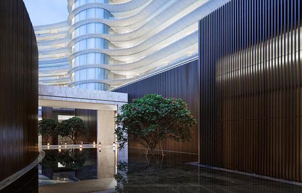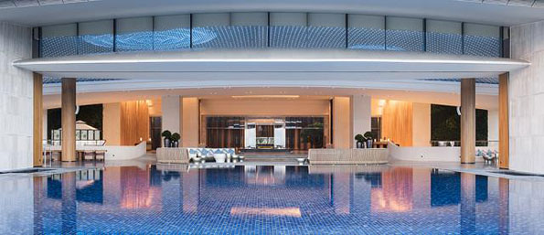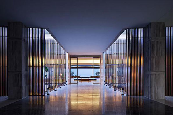 这条长长的灰空间,不仅成为酒店内部的主要动线,而且使各种功能空间有机会自成体系的组织院落。如会议的院落、中餐的院落、spa的院落等等。使用者可以享受到大型酒店的设施,也可以感受到小型酒店的情趣。这些院落既相互独立又相互连接,与上方“悬浮”着400间客房的“庞然大物”融为一体,成为该酒店设计中的另一个亮点。同时,客房的“悬浮”使得更多的功能空间有了欣赏海景的机会。例如在宴会厅的前厅和草坪上,可以顺畅地欣赏到远处猴岛与海平面的亲密关系。并且不管是在竖直方向还是水平方向,各种主要的功能空间观海的视线均相互避让,因此形成了最大化的观海面。这也是酒店管理公司倍加推崇的原因之一。