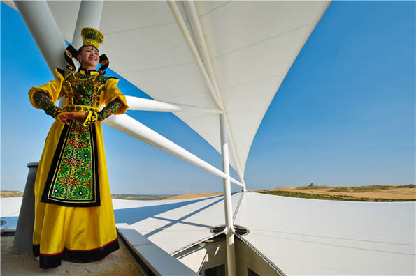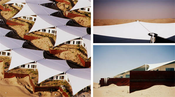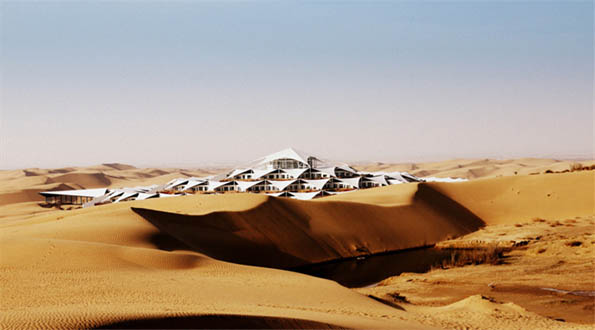 “莲花”的造型,并非PLaT刻意设计的结果。而是由于几何造型兼顾固沙、遮光、防风、收集雨水等作用。单纯从形态上来讲,融入了多次重复同一元素的“阵”的理念来增加建筑的力量感,即简单的几何造型复制累加,生成更大规模的几何造型。莲花这种形状从古至今就在中国人的审美意识里扎入了深深的根,而且在干燥、苍茫的沙漠里融入白色莲花这一亮点,更加相得益彰。