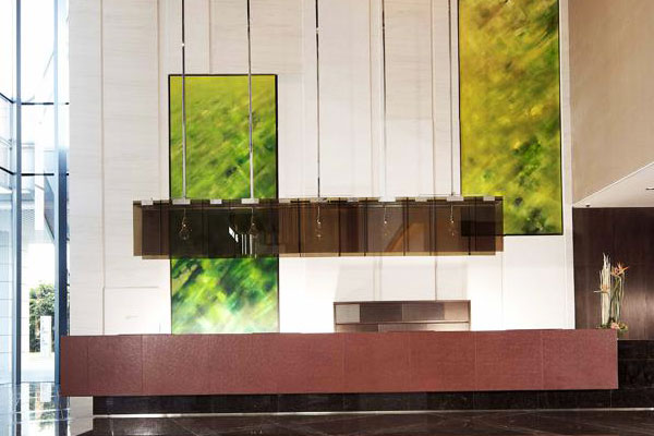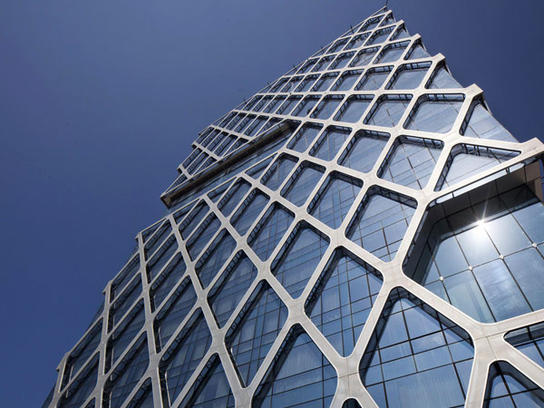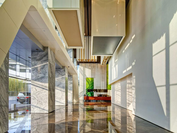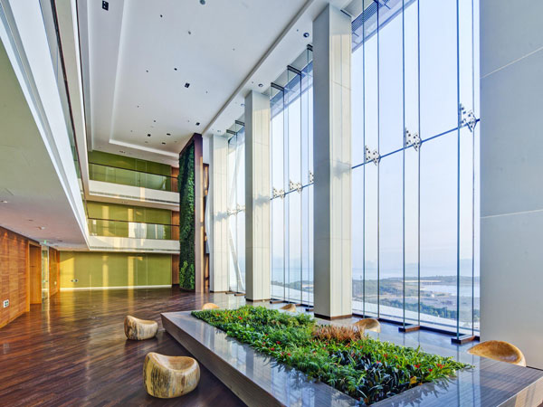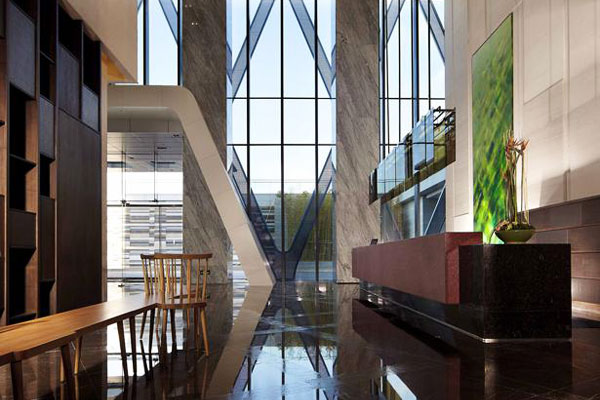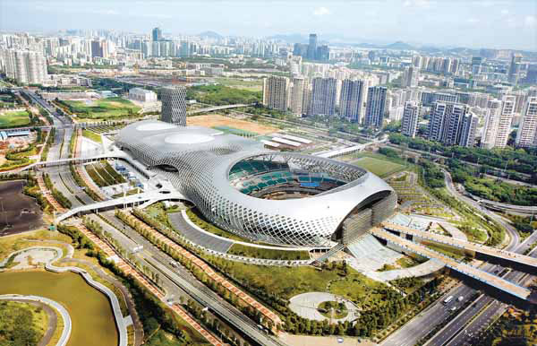 四个中庭外墙高度透明,其全玻璃结构在金属网格中形成开放部位,昭示其开 放性。屋顶花园和餐厅有着海湾和深圳以及香港的开阔视野,而内退的酒店出入口庭院则提供了温馨而又私密的环境,与周围的运动场馆隔开。