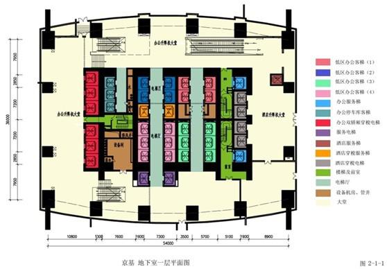 京基金融中心大厦办公层平面近似为长方形,南北两个长边为向外的弧形,长边长57.6m,短边长约为44-49m,核心筒位于中部;低区核心筒尺寸为37.8×23.1m,到了高区由于取消了从负一层及首层往返于39层及40层的办公 4穿梭电梯,核心筒尺寸缩小为34.4×23.1m。