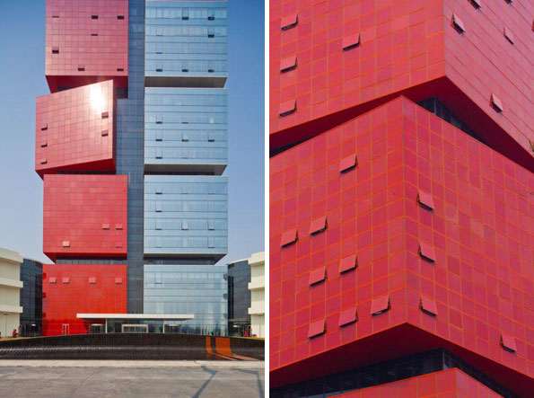 与工业时尚的外形相比,这座建筑的更大意义在于它是少数获得国家绿色建筑最高级别(三星)认定的高层建筑,也是苏州工业园区里唯一一座获此殊荣的建筑物。根据国家《绿色建筑评价标准》GB/T 50378-2006,经过建筑节能计算,本建筑的全年能耗小于参照建筑的全年能耗,节能率为52.9%。这里简要介绍一下其中的部分绿色建筑技术应用:首先值得一提的全玻璃幕墙办公楼“低能耗”的探索与尝试。物流保税大厦的围护墙体采用65厚膨胀聚苯板,加强处理各热桥部位,传热系数经测算≤0.63W/(m2·K)。玻璃幕墙及玻璃采光罩依据建筑设计要求,不同部位均选用高性能LOW-E玻璃,遮阳系数SC≤0.4,热传导系数≤1.7W/(m2·K),具备高可见透过率与低太阳热辐射透过性。幕墙型材采用断热铝合金框料,并利用幕墙分隔及防火封堵提高整体幕墙的热工性能,使幕墙综合热传导系数控制在2.0W/(m2·K)以下。裙房顶部的玻璃采光罩采用6mm超白半钢化+红黑点夹膜片+6mmLOW-E半钢化+12A+6mm钢化玻璃,提高遮阳系数≤0.31,降低夏季空调能耗。