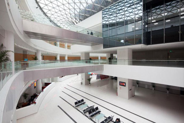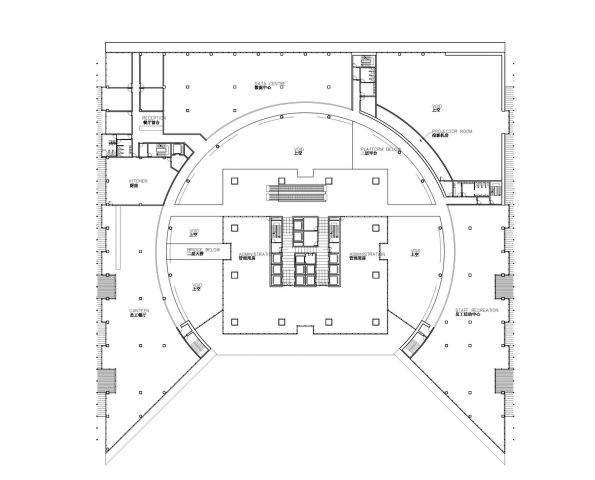 这座建筑的裙房和塔楼相互融合,但各自拥有独立明确的入口,平面布局中对内和对外的区域也有所分开,未来可以根据功能的需要将各个入口连接起来。所有一站式的公共服务功能都设置在底层。具有80米长的柜台和1500平方米的公共等候和填表区域。专用的地下停车场电梯厅和楼梯为人们进出公共服务大厅提供了方便。办公区设置在服务柜台的后面,具有存档和办公辅助设施。底层的办公设施通过内部的开敞楼梯与裙房二层的办公区域联接起来。位于北侧的物流展厅可以从办公塔楼大堂和公共服务大厅进入参观。同时在底层的西北角为货车司机提供了便捷的简餐设施