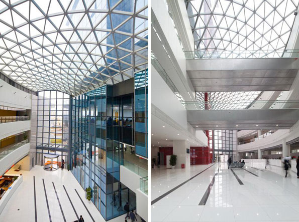 此外,2800平方米的屋顶绿化也是绿色亮点之一。在裙房屋顶采用的轻质薄层屋面绿化技术可以减小通常意义上的屋面荷载,同时也有效降低夏季高温时屋面下室内温度1℃~2℃。该楼的屋面保温层采用80厚挤塑聚苯板,传热系数≤0.32W/(m2·K)。