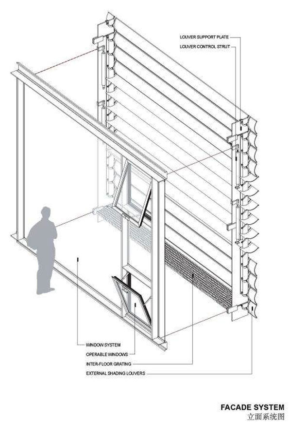 最值得一提的还有建筑主体立面上的遮阳系统,按照太阳的不同照射角度,整个建筑的外立面遮阳体系分为全玻璃幕墙、水平固定遮阳、垂直固定遮阳和电动遮阳四种。遮阳百叶按照竹叶的形象设计为曲面穿孔铝板,在保证室内光线和温度的前提条件下,结合不同幕墙系统丰富着建筑的立面肌理,同时也给室内带来不同的阴影效果。其中电动遮阳百叶作为“表皮装置”,它可根据太阳高度自动调节百叶角度,以保证室内光线和温度保持在最佳状态。