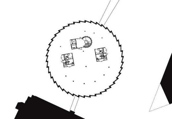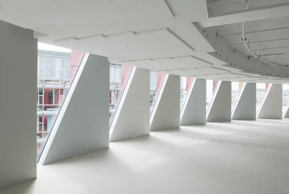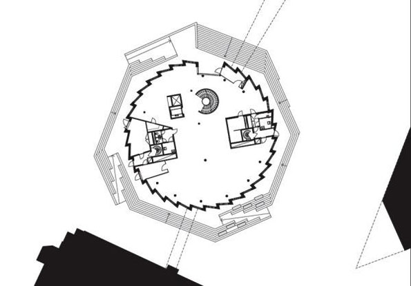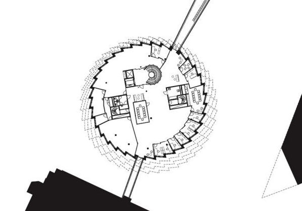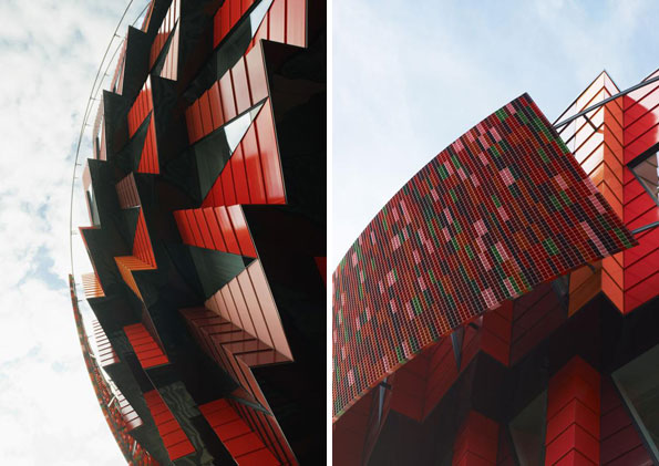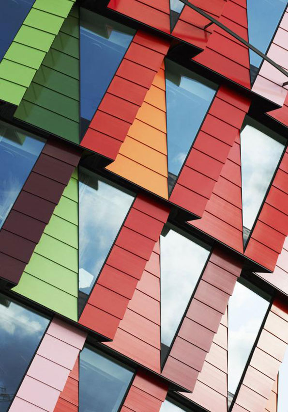 圆柱形建筑坐落于小镇的中心广场,是以意大利文艺复兴为主题的城市规划的一部分。圆形基底以最少的外部维护面积取得了最大的使用面积,每层都比下一层出挑一部分,南面比北面出挑更多,在正午时形成自遮挡,屋顶之上则设计了可随着太阳轨迹旋转的遮阳板。三角形的窗能将阳光引入最需要的地方,在接近天花板的地方开窗最大。彩色陶板交织覆盖在外立面上,在不同的角度、不同的光线下给人不同的感受。红色是附近码头和港口常用的工业漆的颜色,也是建筑的主色调,表皮中还不时夹杂着一些绿色作为对比色,看上去就像秋天的树林。一层是一个科学园,二层是公共空间,环形的流线为人们创造了最大的交流机会,也可用作展览空间。三层以上是办公空间。整个建筑只有一部电梯,楼梯成了垂直交通的主要载体。建筑内设置了人体感应控制的照明和通风系统,能量会被用到真正需要的地方,每年每平方米仅耗电55kWh。